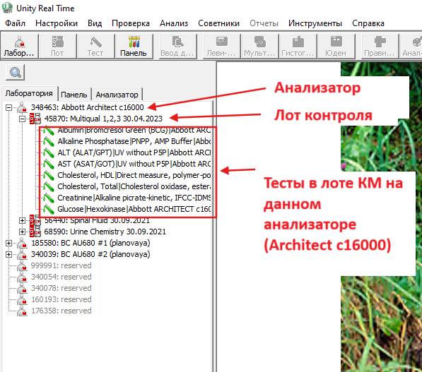 После входа в Юнити слева вы увидите список анализаторов, лотов контрольных материалов и тестов (если вы, конечно, их добавили. Разделы лоты КМ и тесты (аналиты) )
