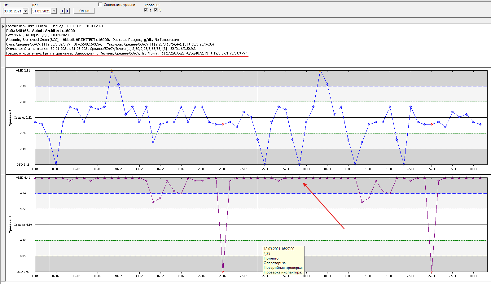 Откроется график Леви-Дженнингса для данного теста. Подробнее про графики здесь: